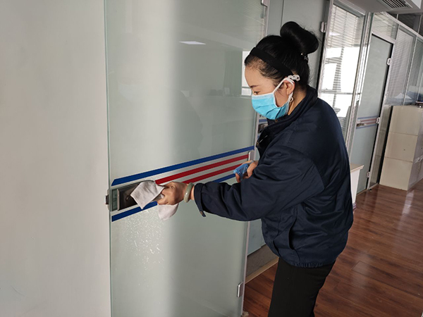 公司為在崗員工發放了口罩、噴壺、消毒酒精等防護用品,每日對各工作場所、班車、車庫、電梯、宿舍等進行定點消毒。